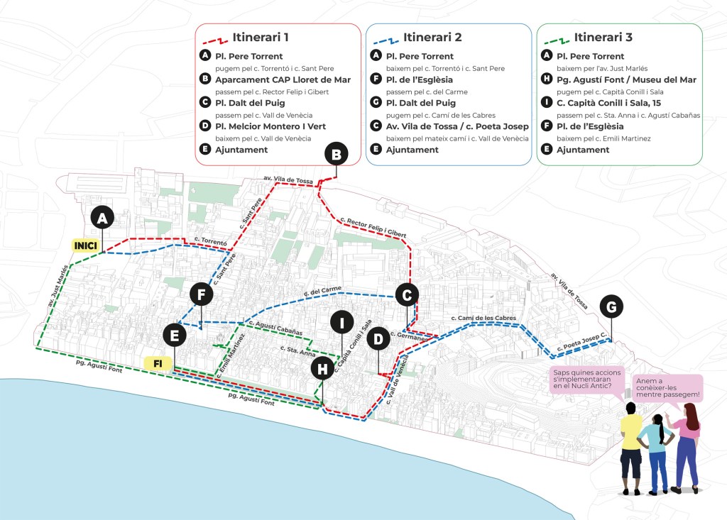 A través d’un recorregut a peu pels carrers del Nucli Antic, coneixerem les diferents accions de millora a implementar durant els pròxims anys, per dinamitzar el Nucli Antic de Lloret de Mar. Aquestes accions són el resultat d’una anàlisi tècnica i d’un procés de debat i acords entre els diferents agents del territori, i poden ser consultats al document del Pla Integral d’Accions de Millora (PIAM).